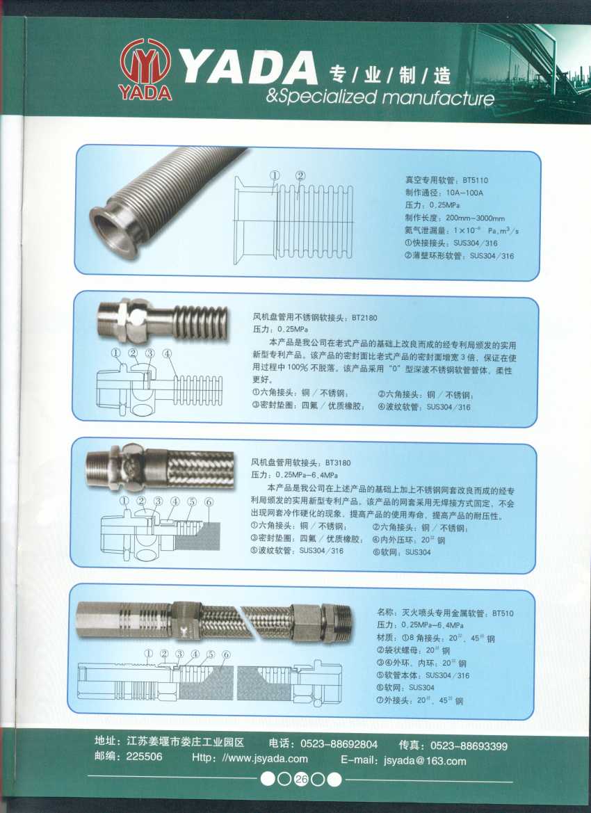 秉天時(shí) 籍地利 仰人和 虔誠(chéng)一個(gè)永恒的理念,創(chuàng)新永續(xù).百諾不如一信,亞達(dá)人堅(jiān)持以信為本,視客戶(hù)如同上帝,把對(duì)信譽(yù)的追求,體現(xiàn)在嚴(yán)格的質(zhì)量控制和完善的客戶(hù)服務(wù)上,讓客戶(hù)百分之百滿(mǎn)意是亞達(dá)人不變的信念。 本廠系ISO9001質(zhì)量認(rèn)證企業(yè)、計(jì)量合格企業(yè)。本廠專(zhuān)業(yè)致力于生產(chǎn)不銹鋼金屬波紋軟管、超高壓、高壓膠管、波紋管補(bǔ)償器(膨脹節(jié))、立式、臥式、冷卻器。本廠產(chǎn)品具有承受壓力高、彎曲半徑小、抗疲勞性能強(qiáng)、使用壽命長(zhǎng)等特點(diǎn)。廣泛應(yīng)用于電力、石化、冶金、水泥建材、工程機(jī)械、礦山及液壓系統(tǒng)。產(chǎn)品暢銷(xiāo)全國(guó)各地。 今日亞達(dá)之成功源自諸多客戶(hù)的厚愛(ài),明天的輝煌更離不開(kāi)您對(duì)我的支持與信賴(lài)。查看更多>>